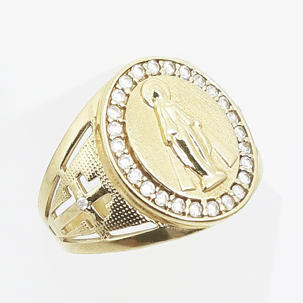 Anel Nossa Senhora Aparecida largo em Ouro 18K, com 26 pedras de zircônia 1,25 mm.
