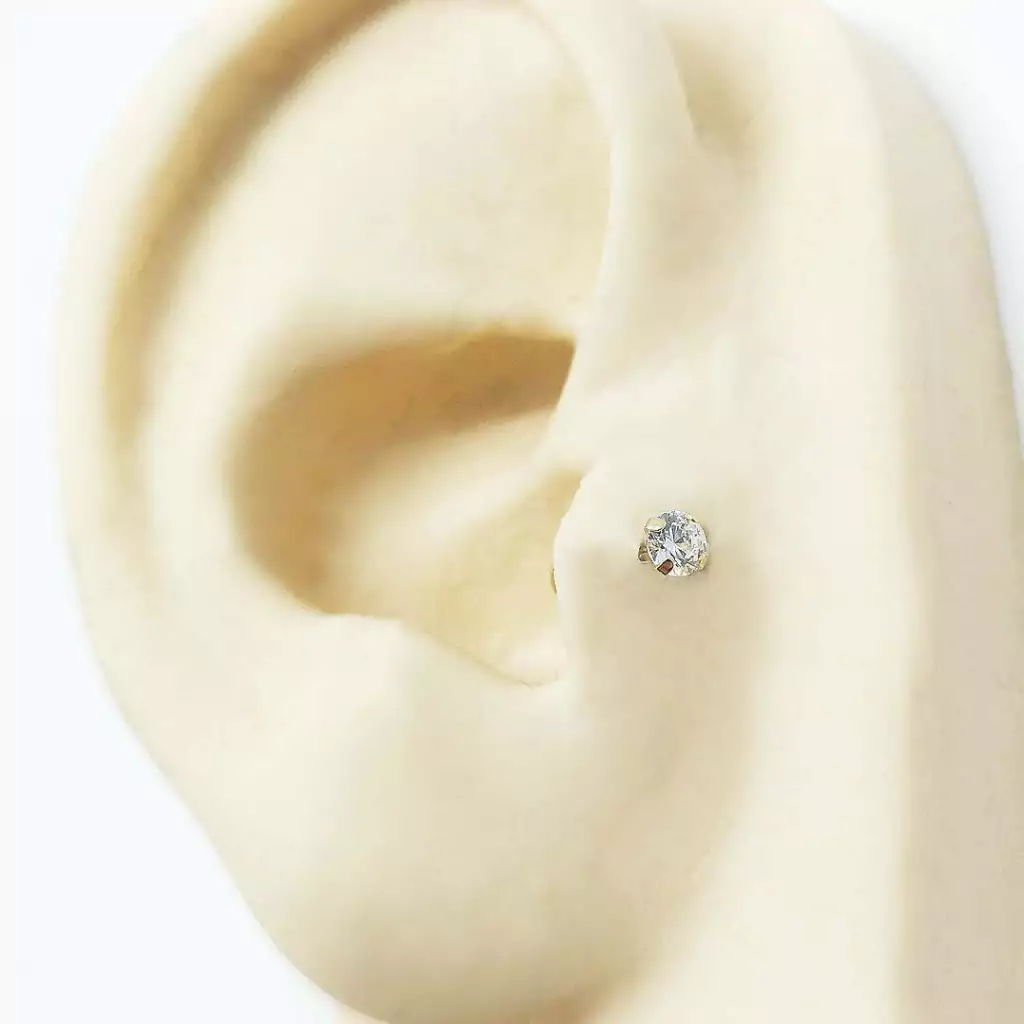 Piercing modelo reto para trágus com uma pedra de zircônia 3,00 mm, em Ouro 18K.